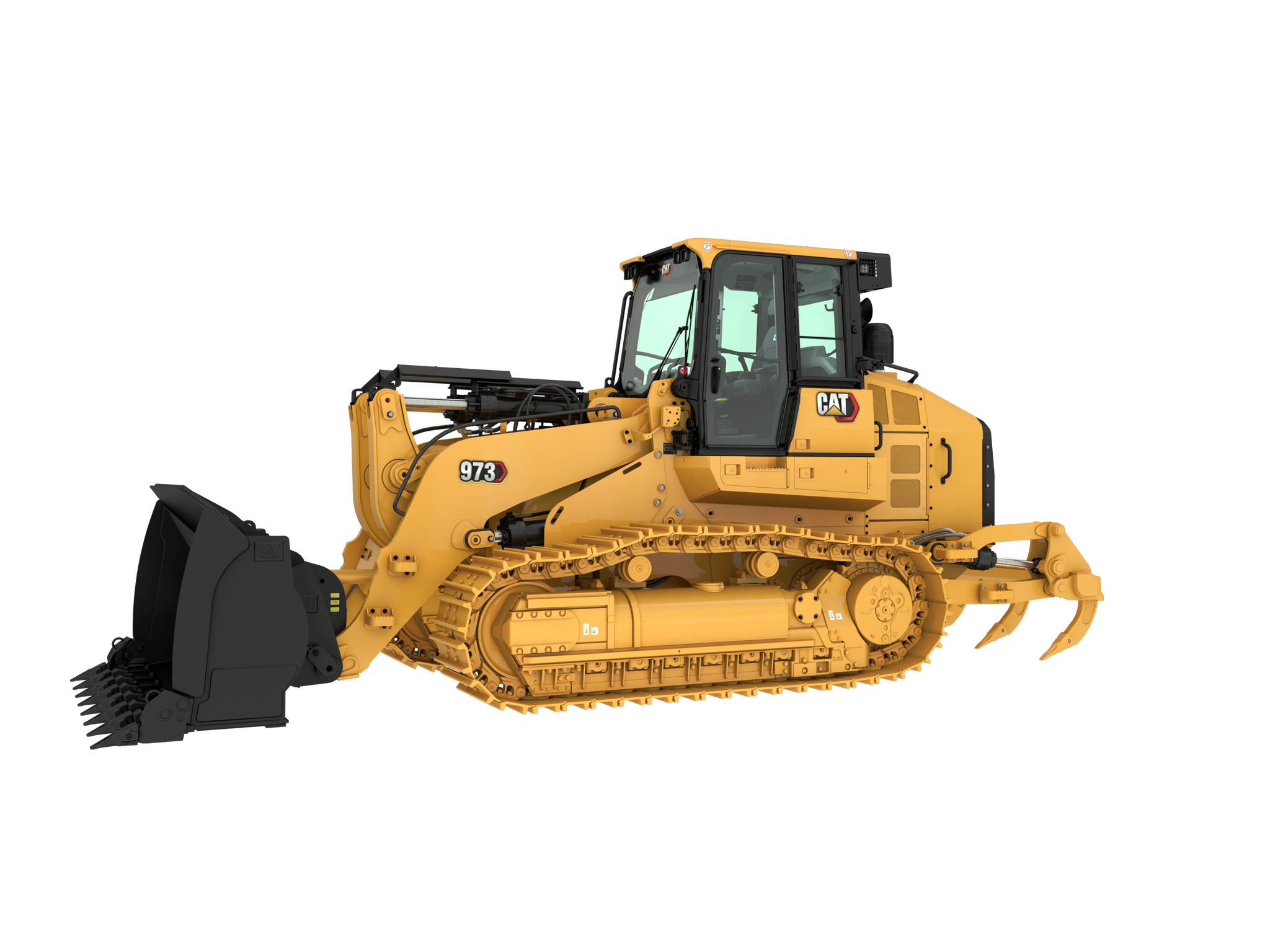 La chargeuse sur chenilles CAT 973 est un engin de construction polyvalent, équipé d'un godet de 4000 litres, idéal pour le chargement de matériaux en vrac sur les chantiers.