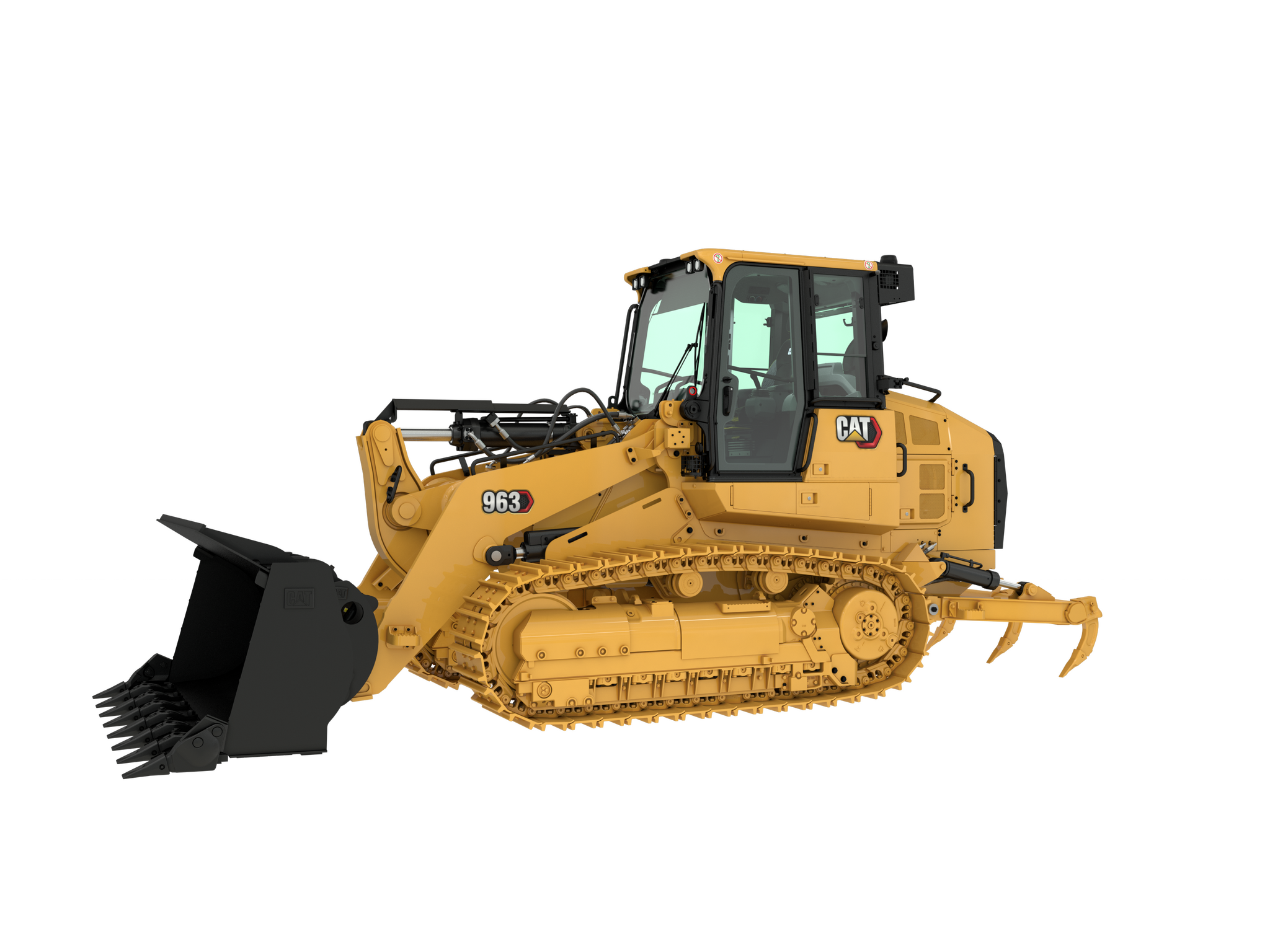La chargeuse sur chenilles 963 WH de CAT est conçue spécialement pour l'industrie lourde. Elle est équipée d'un godet de grande capacité et peut manipuler une variété de matériaux.
