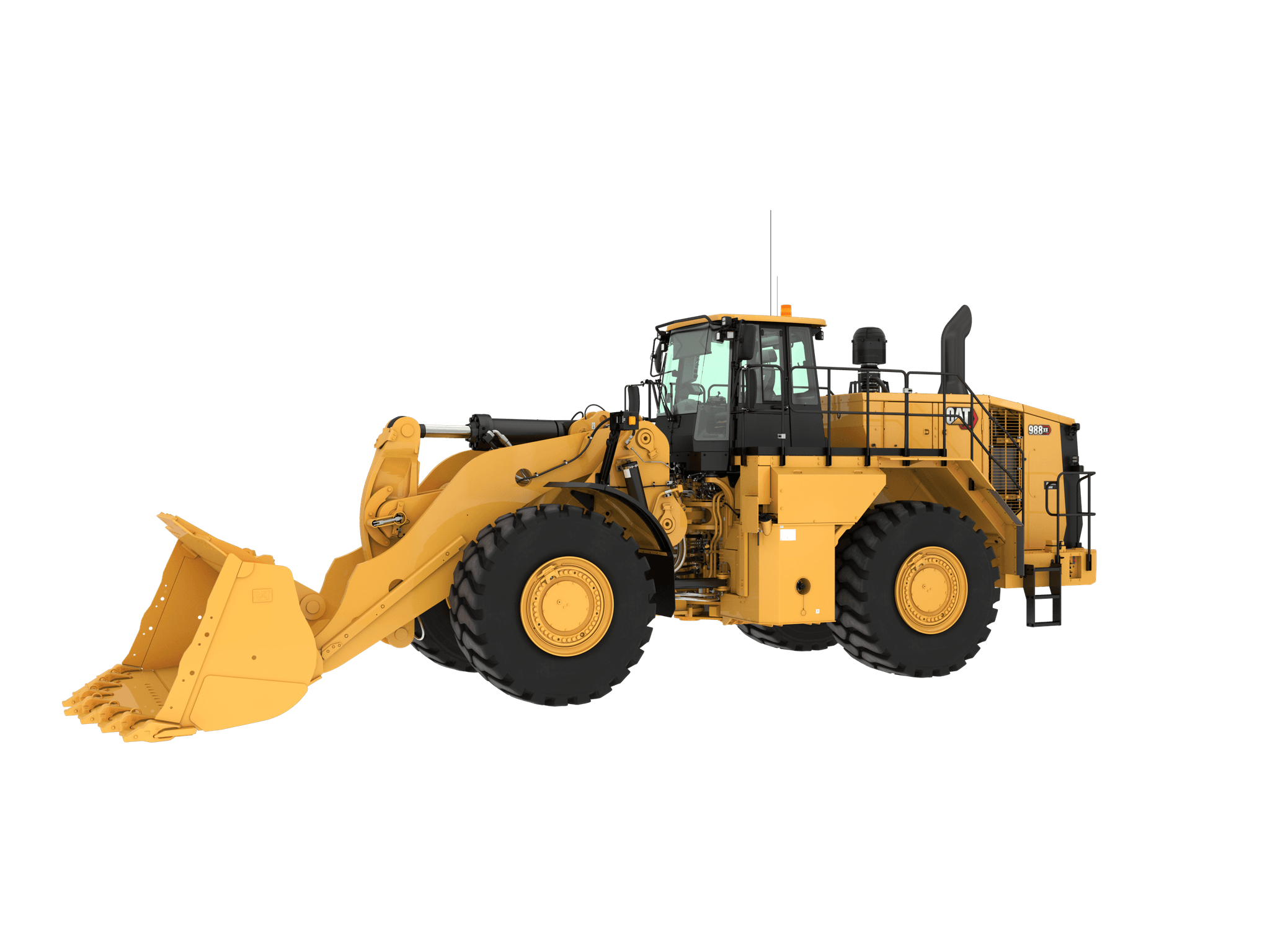 Le chargeur sur pneus CAT 988 XE est une machine de construction massive équipée d'un godet de 7 200 litres, conçue pour répondre aux applications de chargement de matériaux en vrac les plus exigeantes, telles que les carrières et les mines.