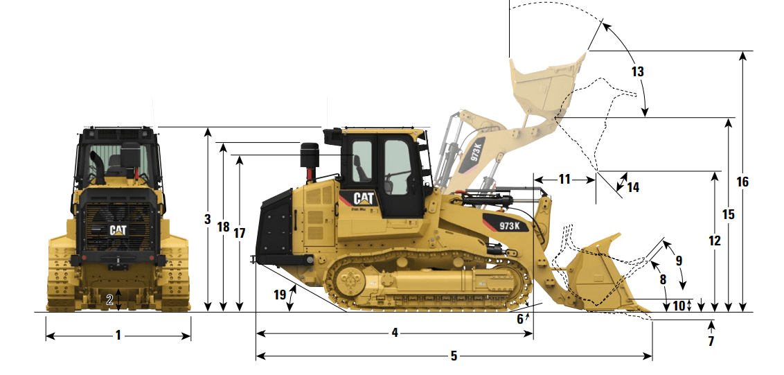 La chargeuse sur chenilles CAT 973 est un engin de construction polyvalent, équipé d'un godet de 4000 litres, idéal pour le chargement de matériaux en vrac sur les chantiers.